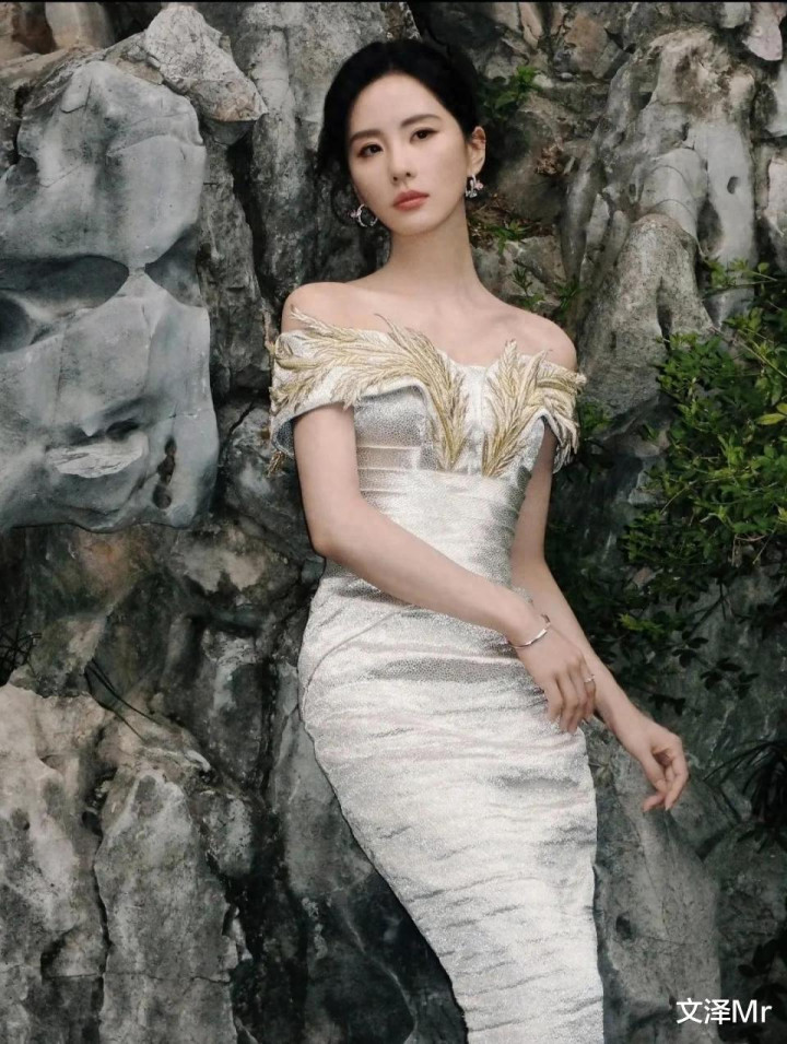 照片里,刘诗诗倚靠在古朴山石旁。银色礼服勾勒出曼妙身姿,一字肩设计大方露出精致肩颈线,肩部金色羽毛装饰如同灵动羽翼,为整体造型增添华丽感。她的颜值在自然古朴背景衬托下,愈发显得温润典雅,仿佛从古典画卷中走出的佳人,眉眼间藏着东方女性的含蓄与柔美,这画面像是一场时空对话,山石的沉稳厚重与她时尚造型碰撞,尽显独特魅力。