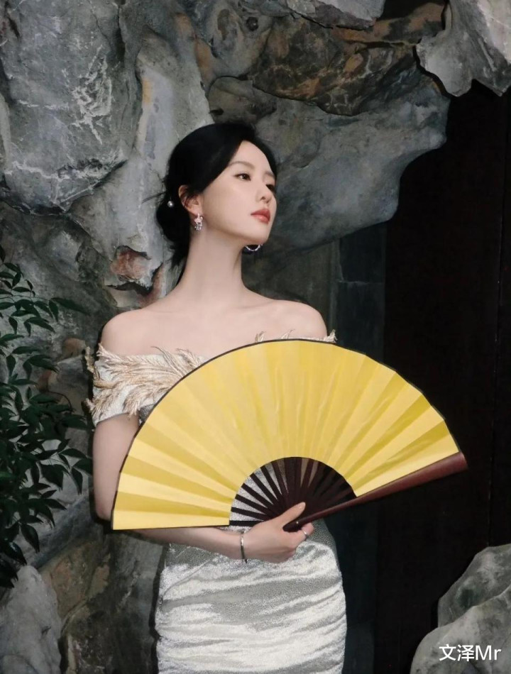 于山石旁轻摇黄色折扇,瞬间为画面注入灵动的东方雅韵。银色礼服的现代时尚感,因这把传统折扇产生奇妙化学反应。一字肩设计露出的优美肩线,与折扇开合间的古典意趣相呼应,她的神态悠然,仿佛在以扇为媒介,沟通古今时尚。从古典角色一路走来,刘诗诗用自身成长诠释东方美学与现代时尚融合,这组大片里,不同场景切换与穿搭、气质呼应,让她成为时尚圈独特 “东方符号”,持续用魅力书写时尚与文化交融的精彩篇章 。